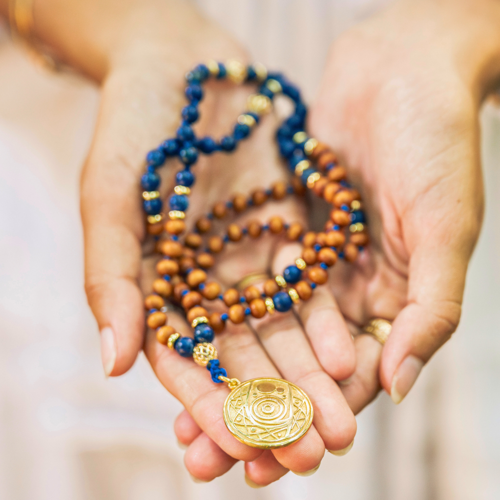 Lapis Lazuli, Sandalwood, 18K Gold, and Becoming Ageless Vermeil Pendant Charged Mala, Handmade With Love!