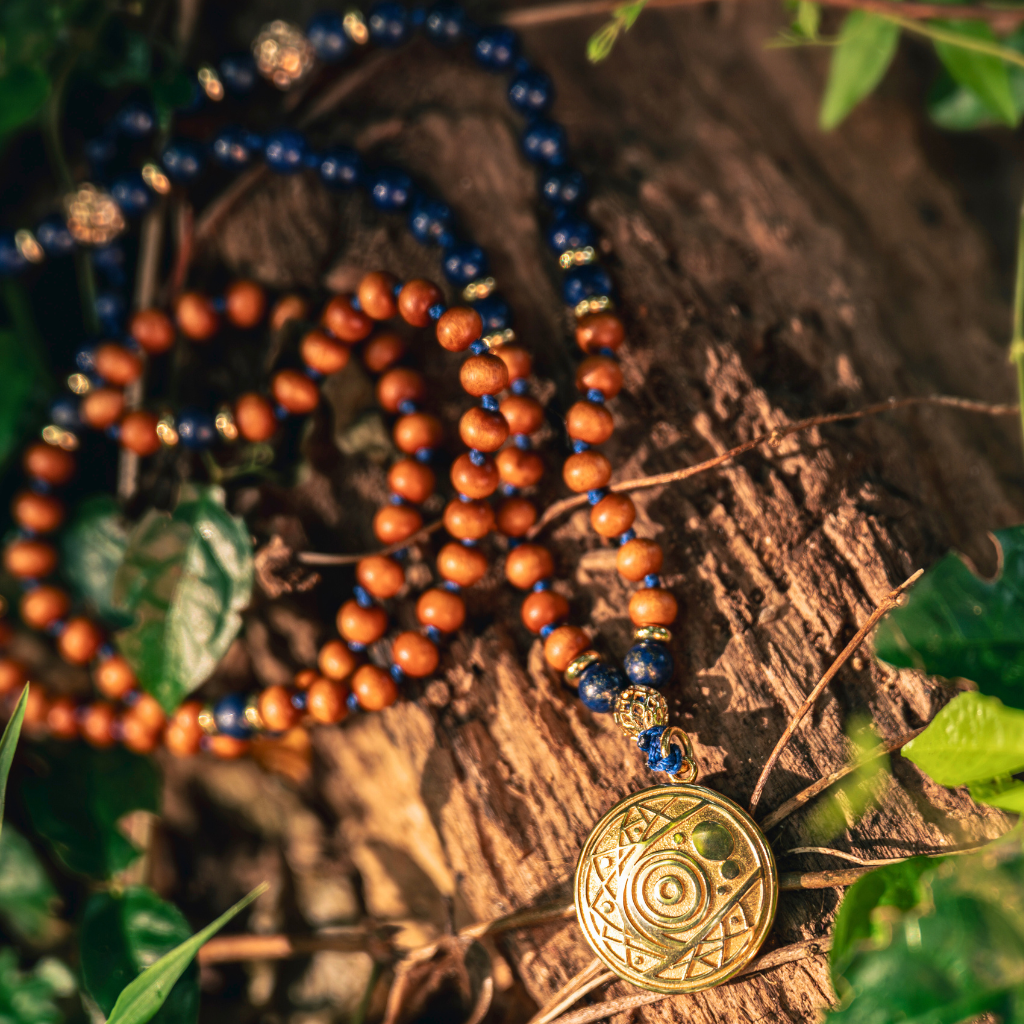 108 Individually Knotted Lapis, Sandalwood, and 18k Gold beads. The Awakening Courage Mala has 41 Lapis beads, 64 Sandalwood Beads, and three 18K Gold beads, accented with 18K gold spacer beads, all individually knotted with love!