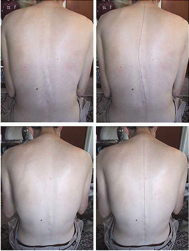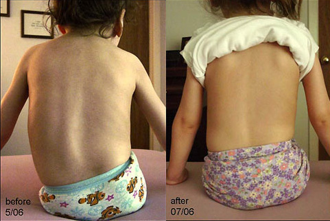 I am most excited to forward recent photos of a four-year-old little girl who was diagnosed with Spinal Muscular Atrophy (SMA). The first photo was taken in May 2006 prior to Quantum-Touch, the second in July. Previously the child had developed scoliosis which seemed to be getting worse even though her back muscles had become stronger.