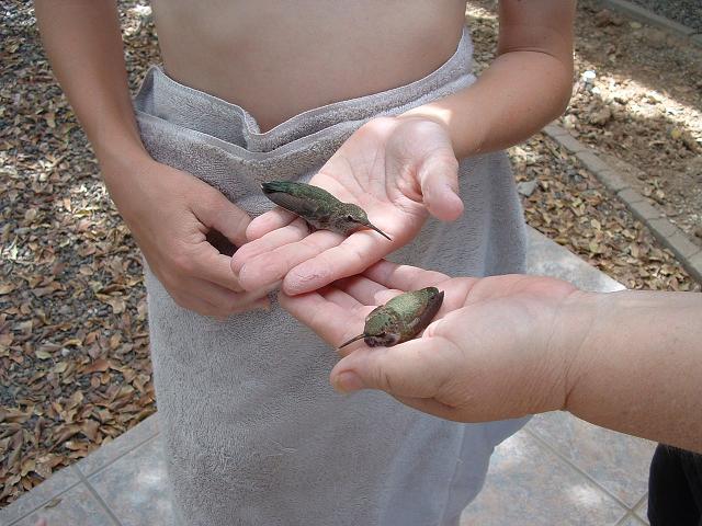 My 3 grandchildren, ages 5, 11 and 13 were visiting and had just gotten out of our spa in the back yard. The 5 year old called excitedly to the other two to look on the ground and there were two young humming birds lying on the ground motionless!
