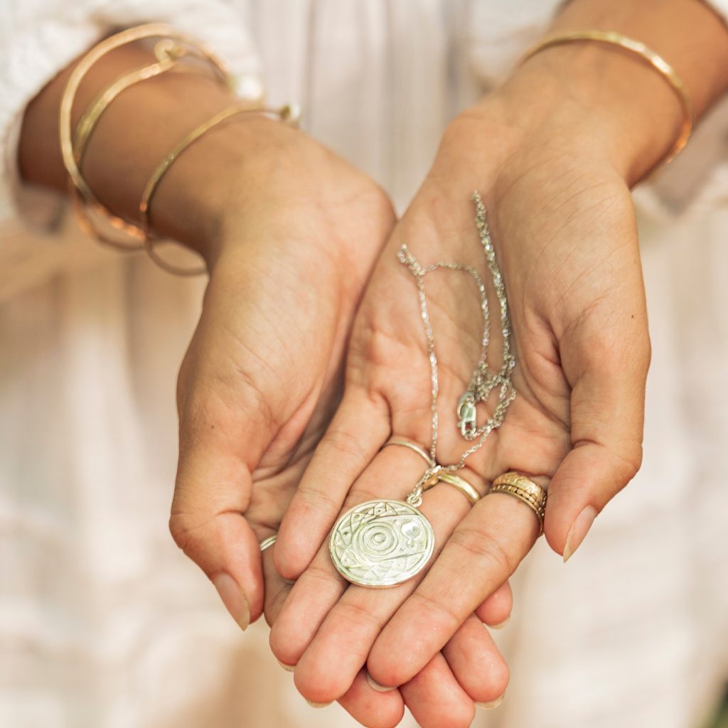 The pendant design represents our connection to spirituality symbolized by the circles. The geometric shapes represent spiritual intelligence creating order with the help of our Higher Self. We can use this to tap into the Mystery of the Life-Force.