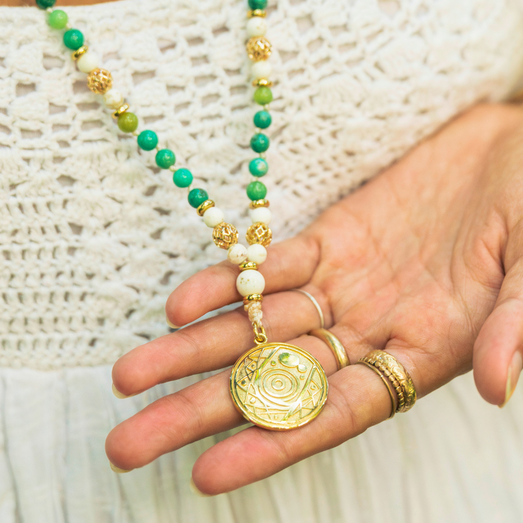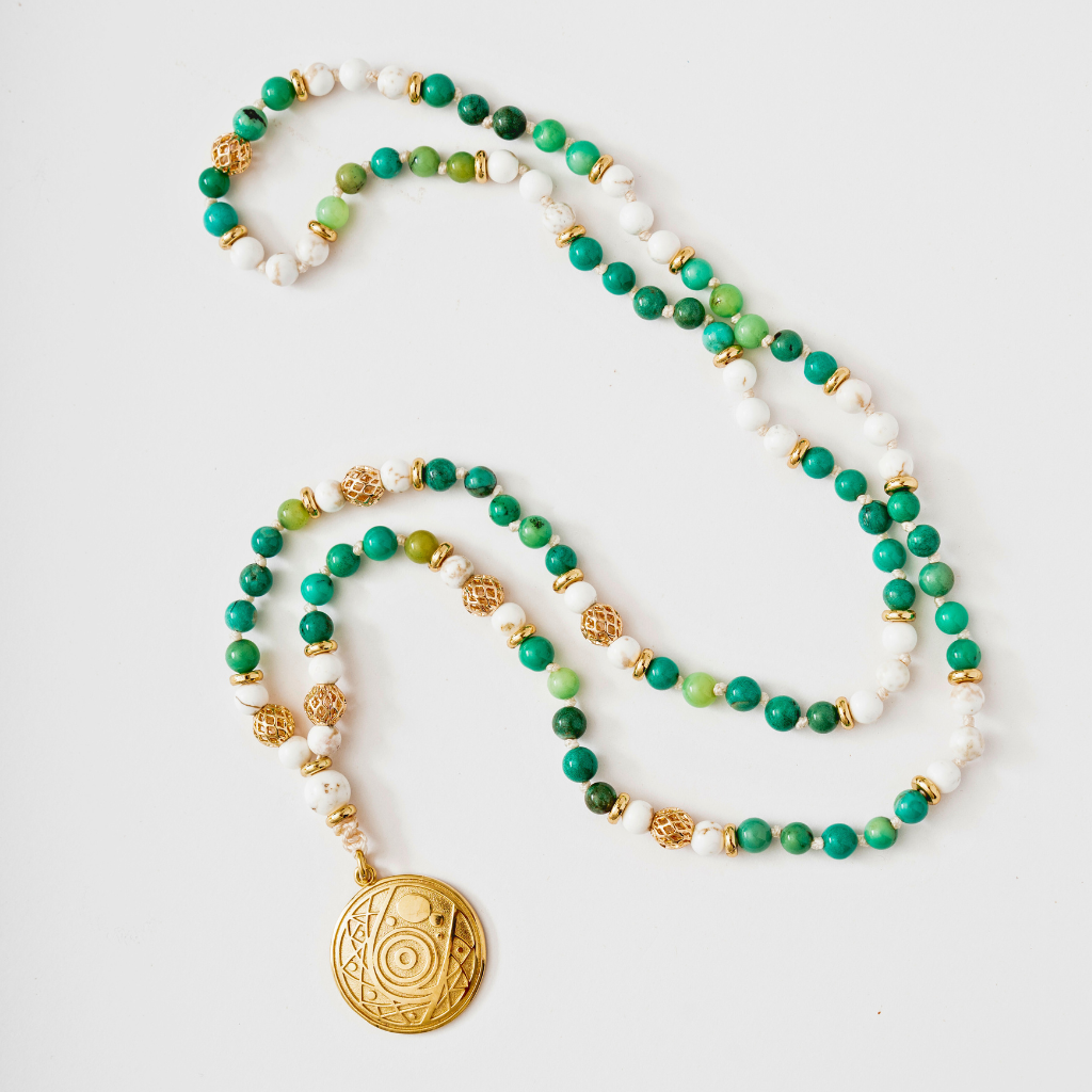 White Turquoise, Chrysoprase, 18K Gold, and Becoming Ageless Vermeil Pendant Charged Mala, Handmade With Love!