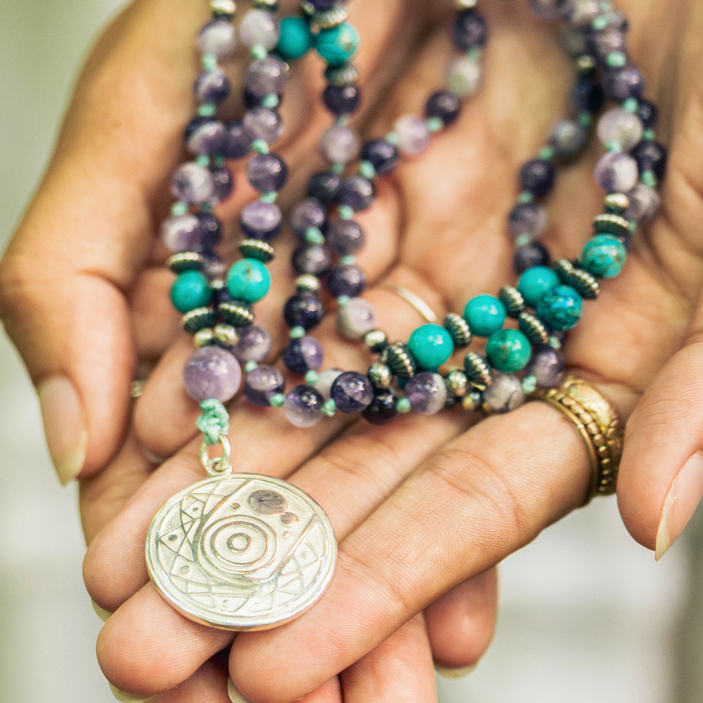 Blue Turquoise, Amethyst, and Sterling Silver Charged Mala, Handmade With Love! More >