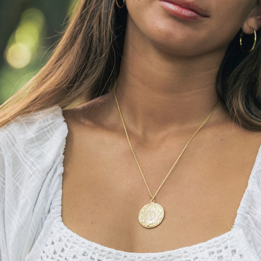 The Gold Plated Sterling Silver Pendant is 925 sterling silver with a gold plating. There is no lead or nickel used in the manufacturing of our pieces. Each pendant is 28 millimeters (approximately 1.1 inch) in diameter.